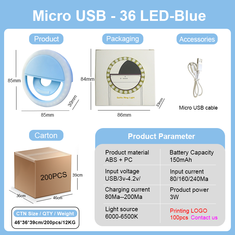 Customized selfie light, mobile phone LED, portable clip for tripod, camera holder with charging stick, phone selfie ring light