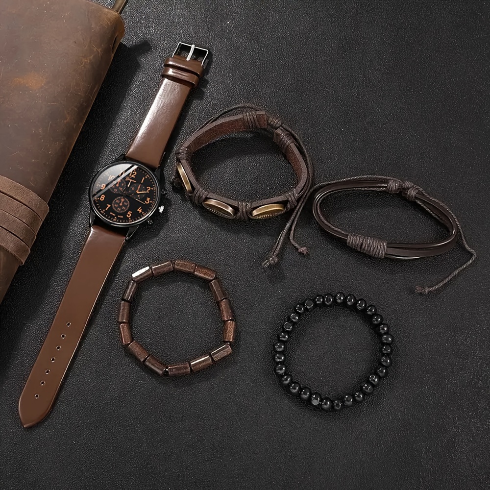 192041 5pcs/set Men's Brown Leather Strap Watch for Men and Fashionable Men's Watch Sets