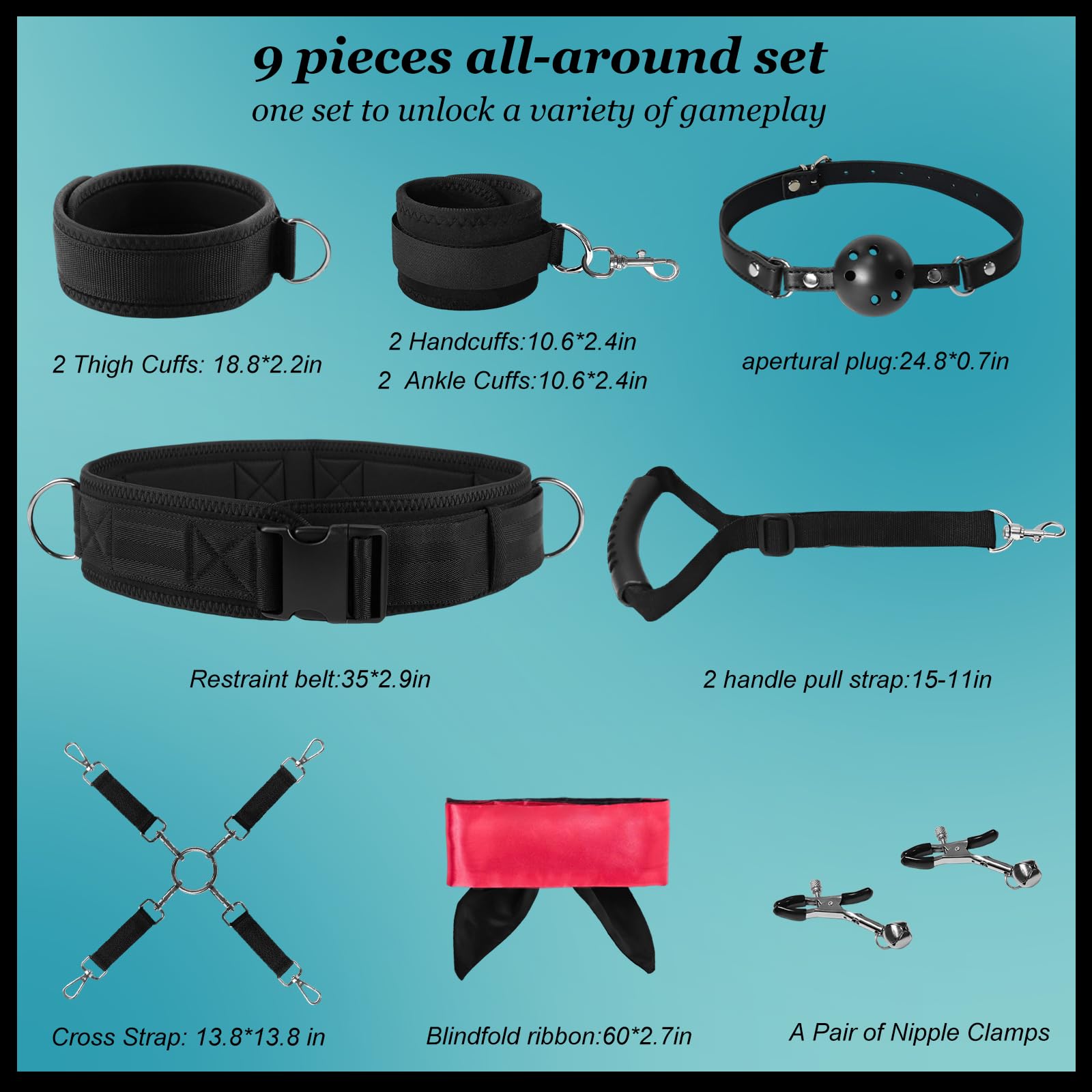 Adjustable handcuffs, leg cuffs, thigh cuffs, mouth cuffs, eye mask clips, 9-piece restraint kit, sexual restraint BDSM, female adult couple toy