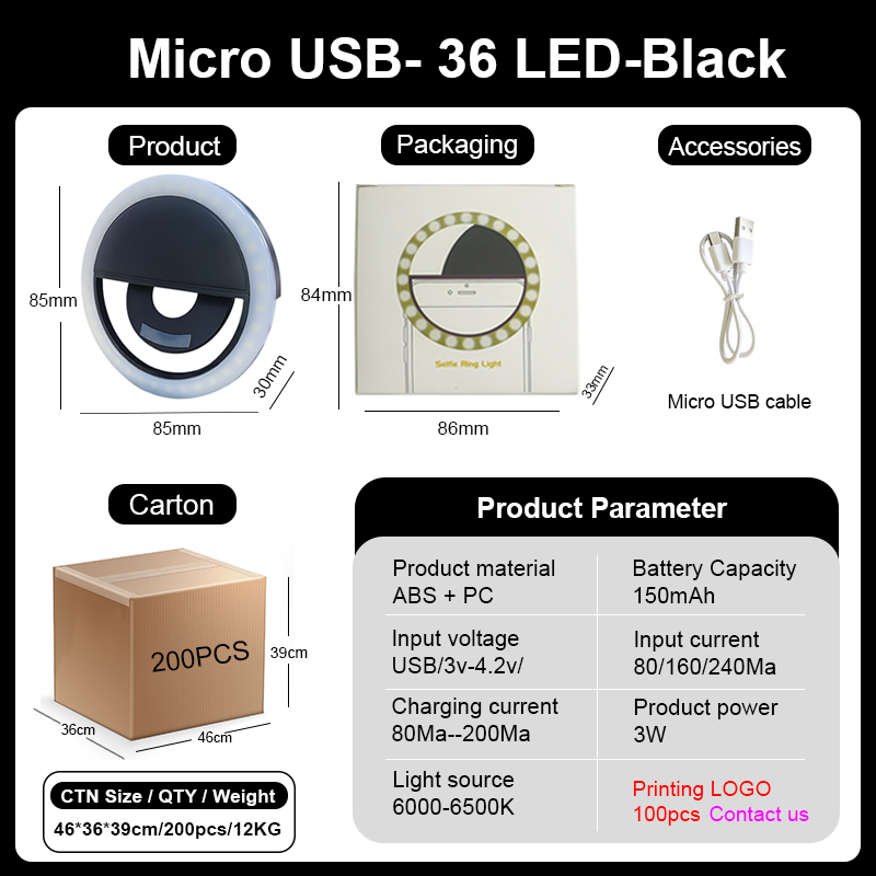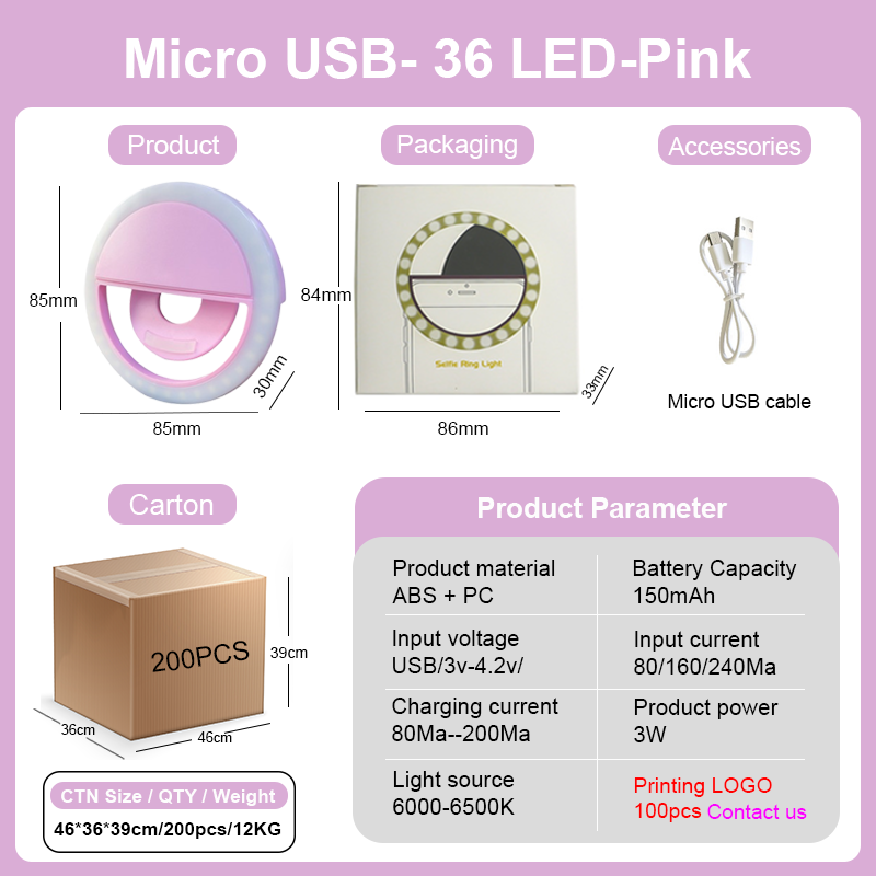 Customized selfie light, mobile phone LED, portable clip for tripod, camera holder with charging stick, phone selfie ring light