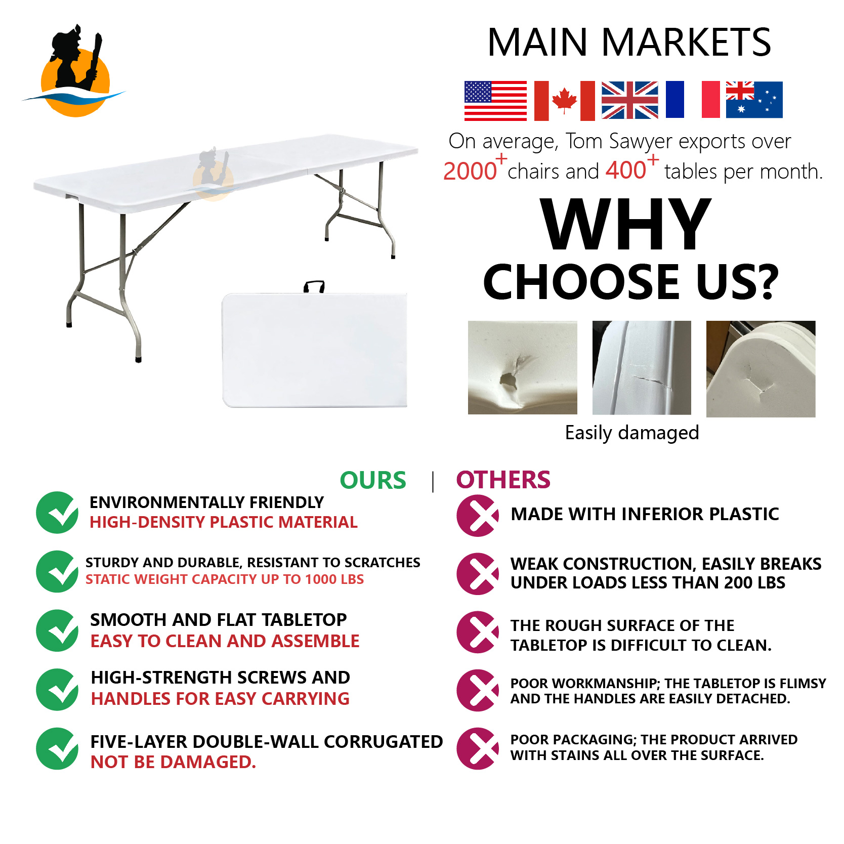 Wholesale portable outdoor folding table, foldable restaurant table, 4/6/8 feet white plastic table and chair set suitable for events and gatherings