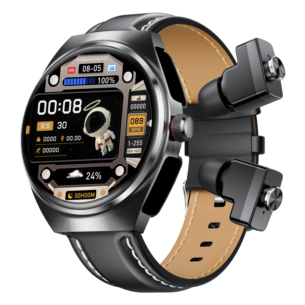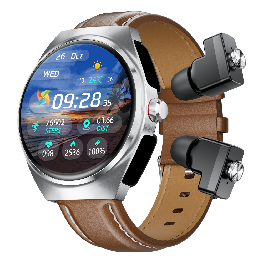 2025 Best New Smart Watch Leather Strap, 2-in-1 Earbuds and Fitness Tracker with Heart Rate Monitor