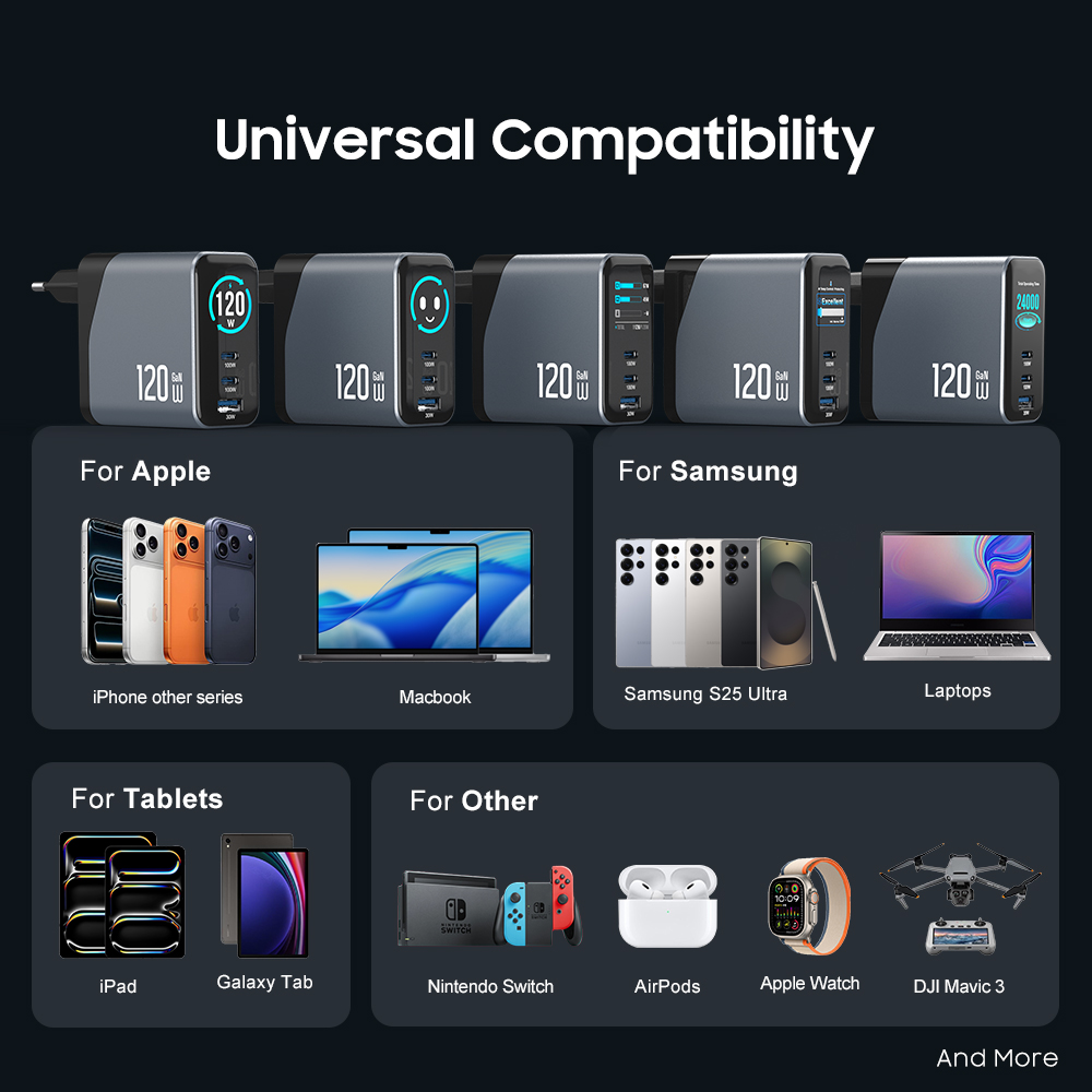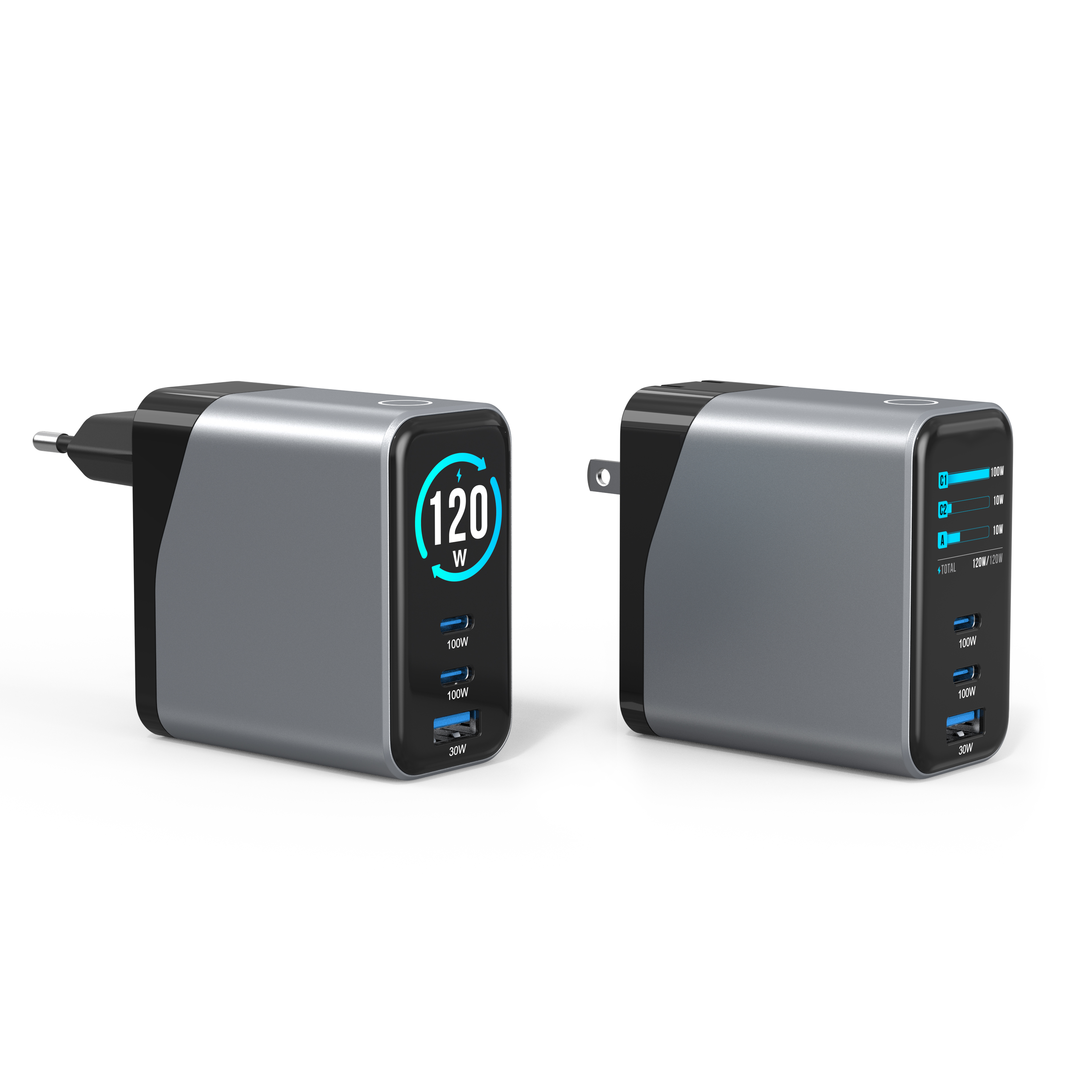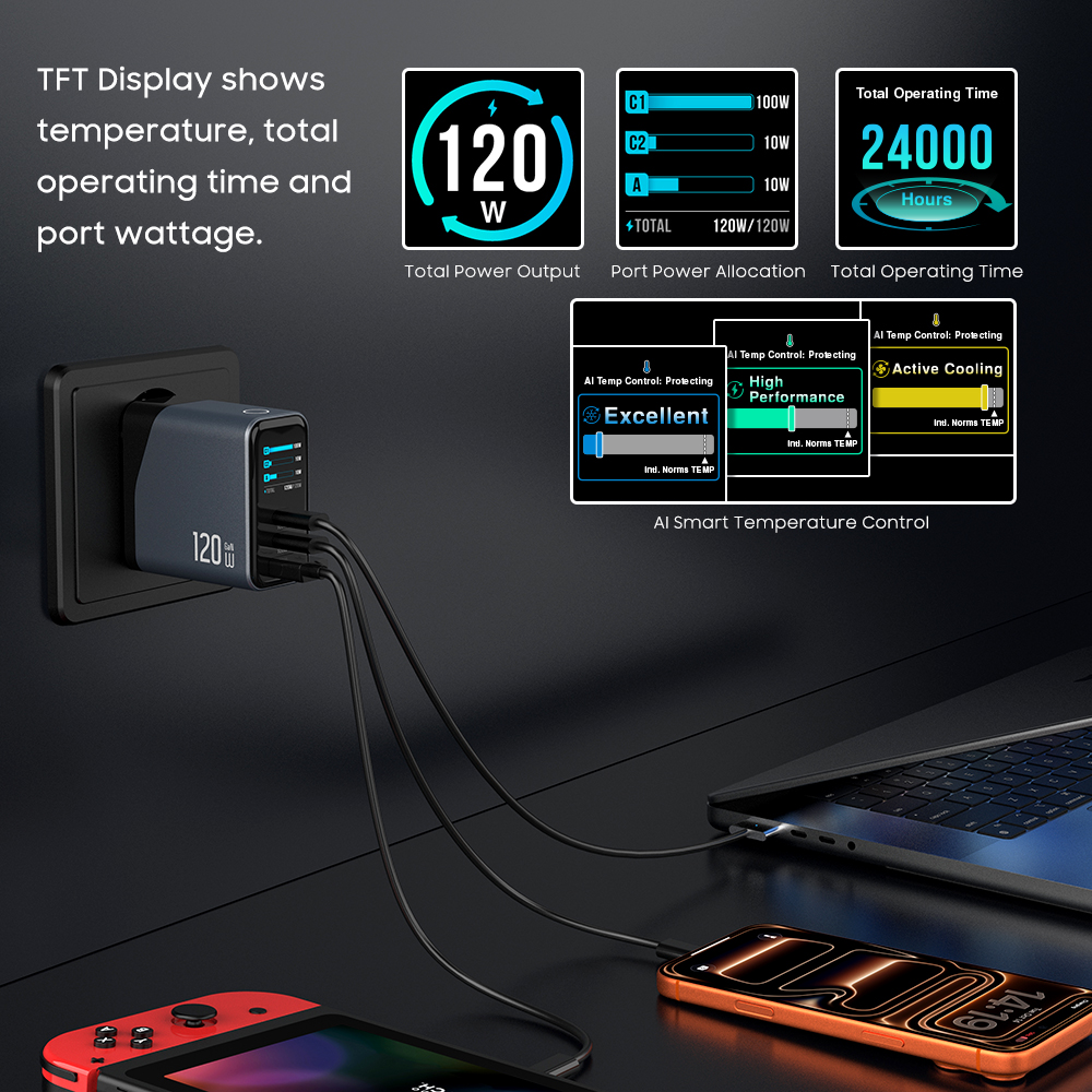 Laptop Charger 120W Max USB Charger 3-port Multi Device Fast Charging with TFT Display for iphone samsung 120W Charger