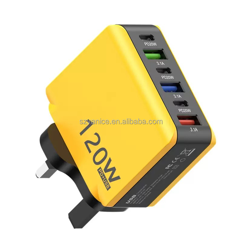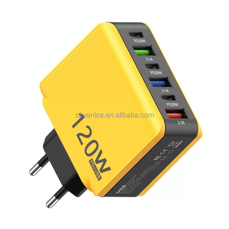EU/US/UK plug 120W 3 USB+3 usb-c PD 6-port fast charger 120W USB Type-C multi port fast charging Xiaomi/Samsung/Huawei